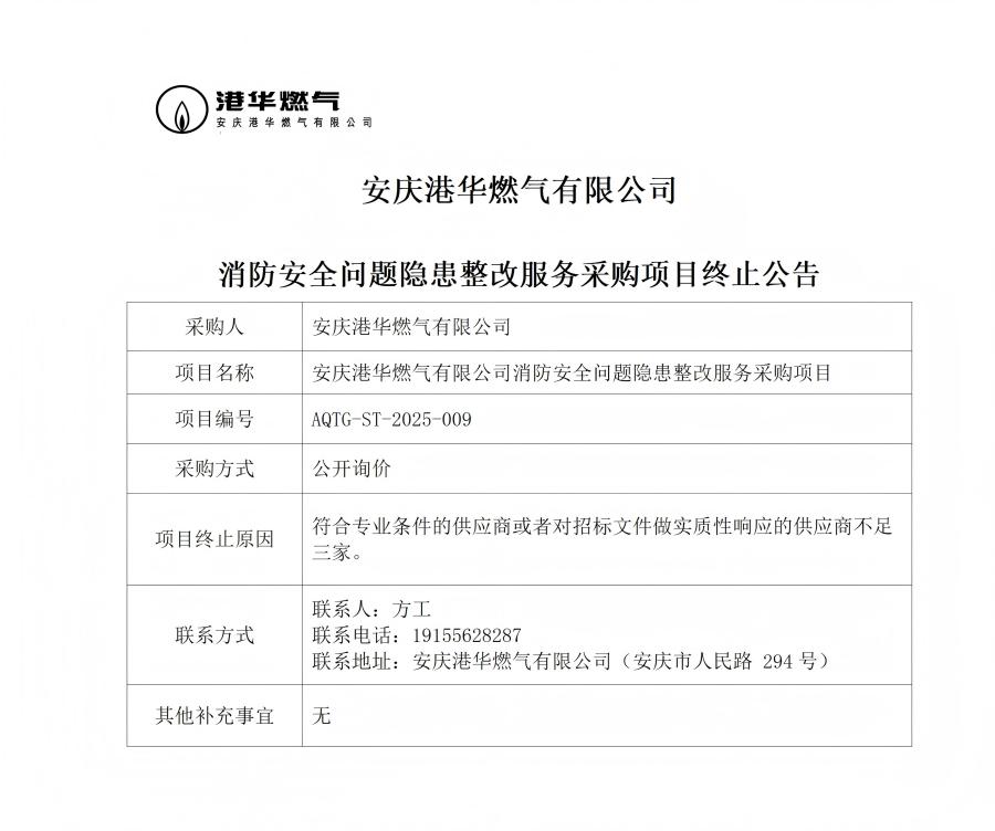 安慶港華燃?xì)庥邢薰鞠腊踩珕?wèn)題隱患整改服務(wù)采購(gòu)項(xiàng)目終止公告