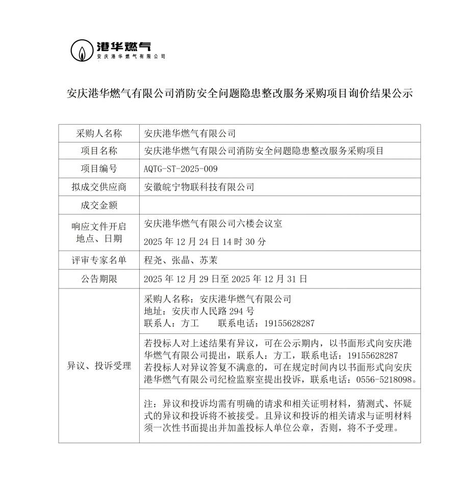 安慶港華燃?xì)庥邢薰鞠腊踩珕?wèn)題隱患整改服務(wù)采購(gòu)項(xiàng)目詢(xún)價(jià)結(jié)果公示