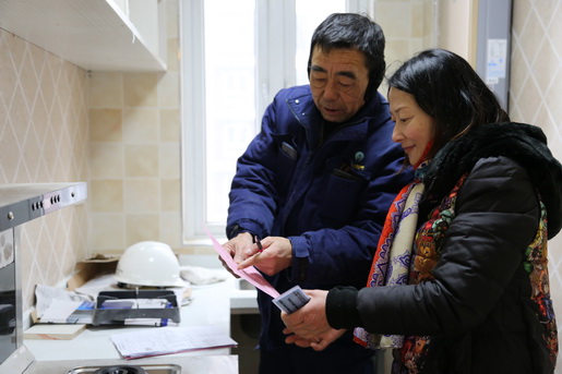 圖為客服維修人員冒著大雪為客戶提供維修服務,并指導客戶安全用氣。